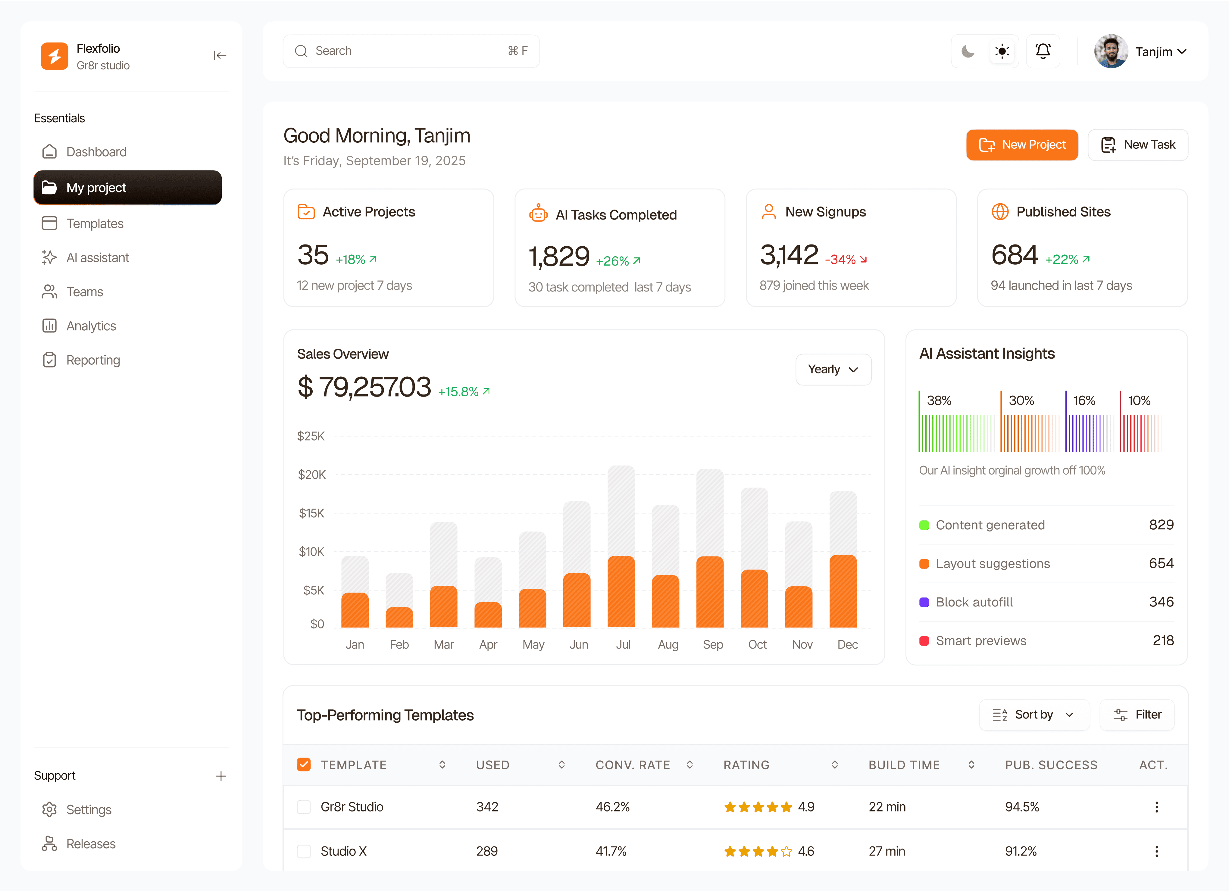 Pre-optimized templates and AI tools that help founders launch bold, client winning sites without the usual grind.